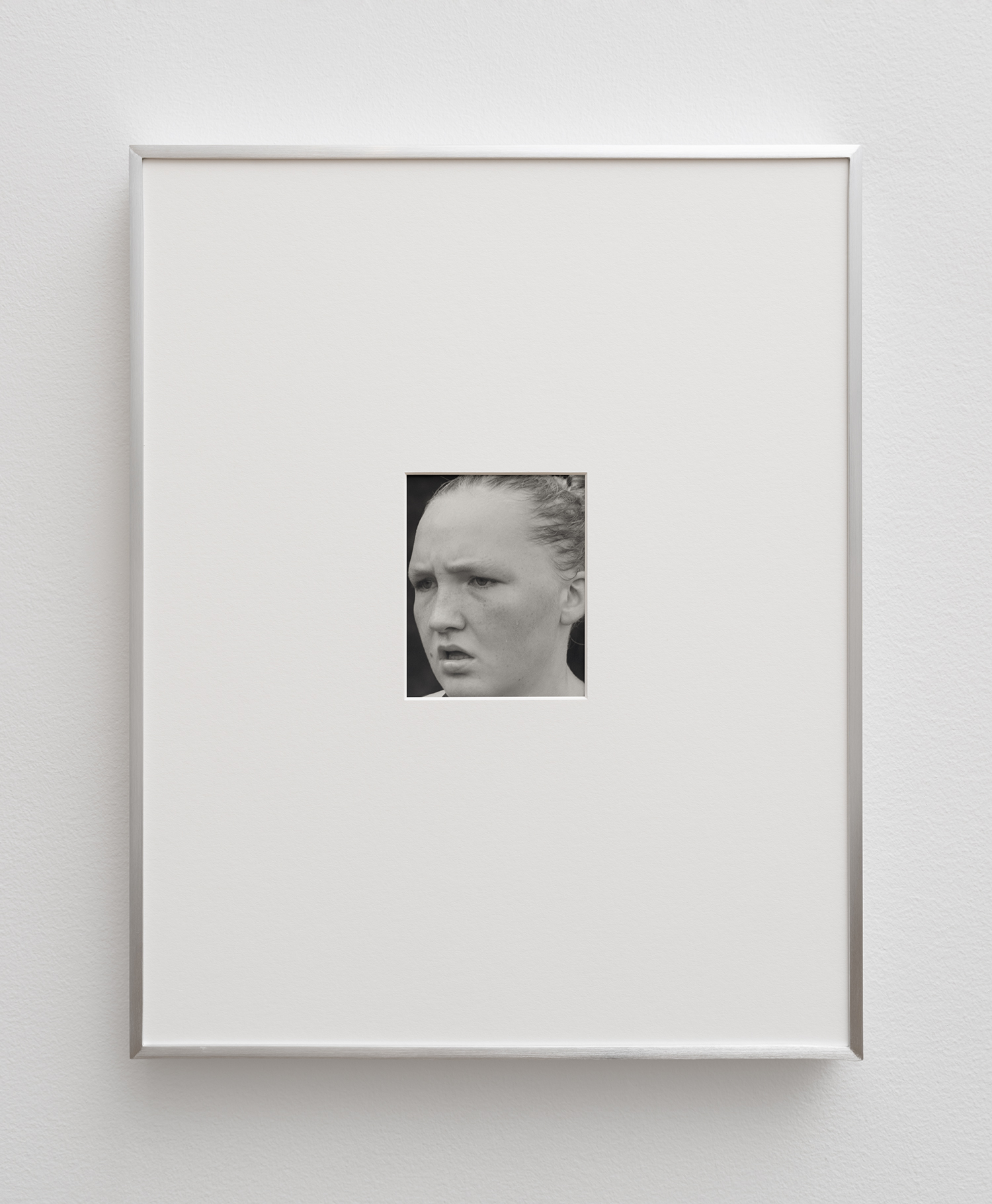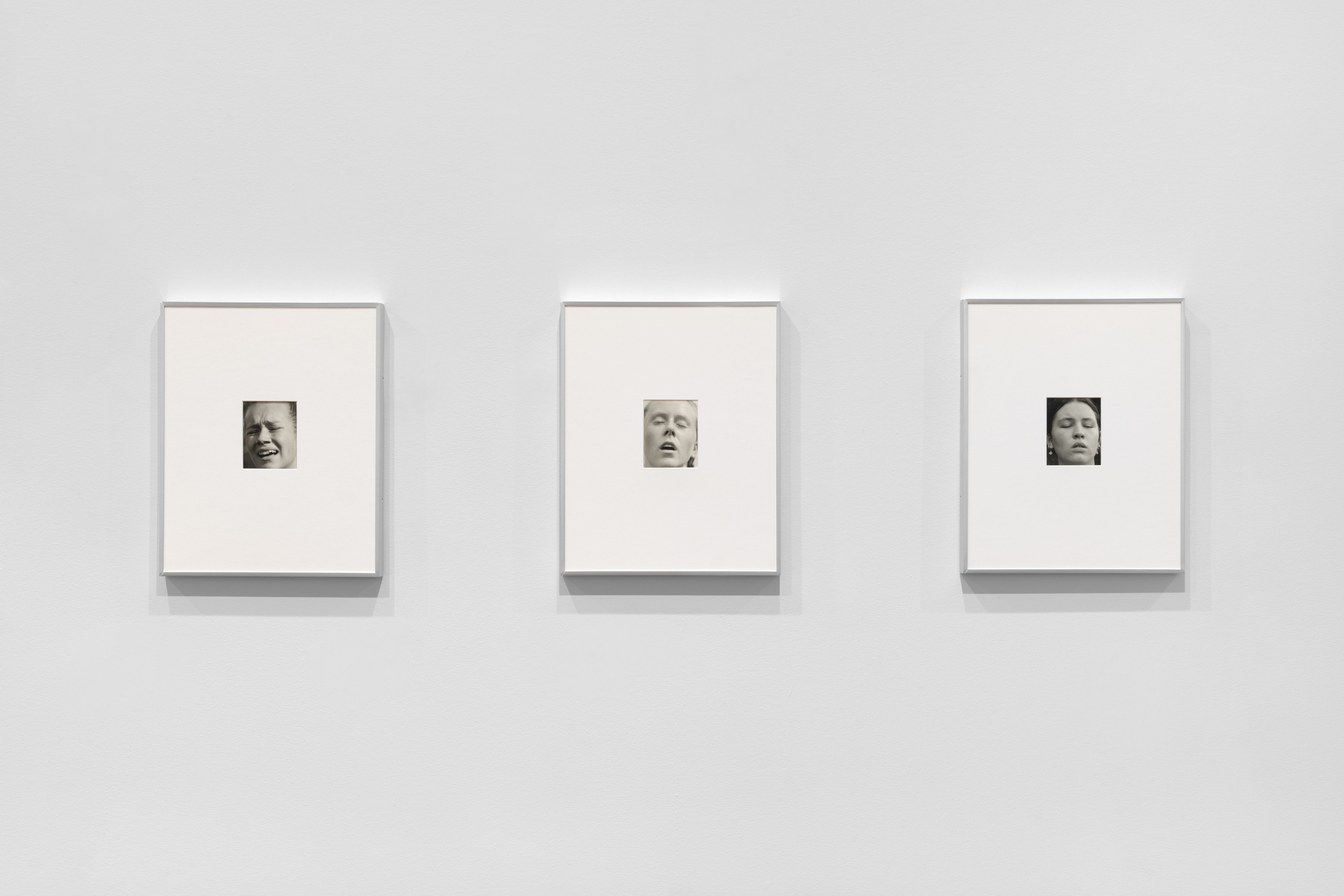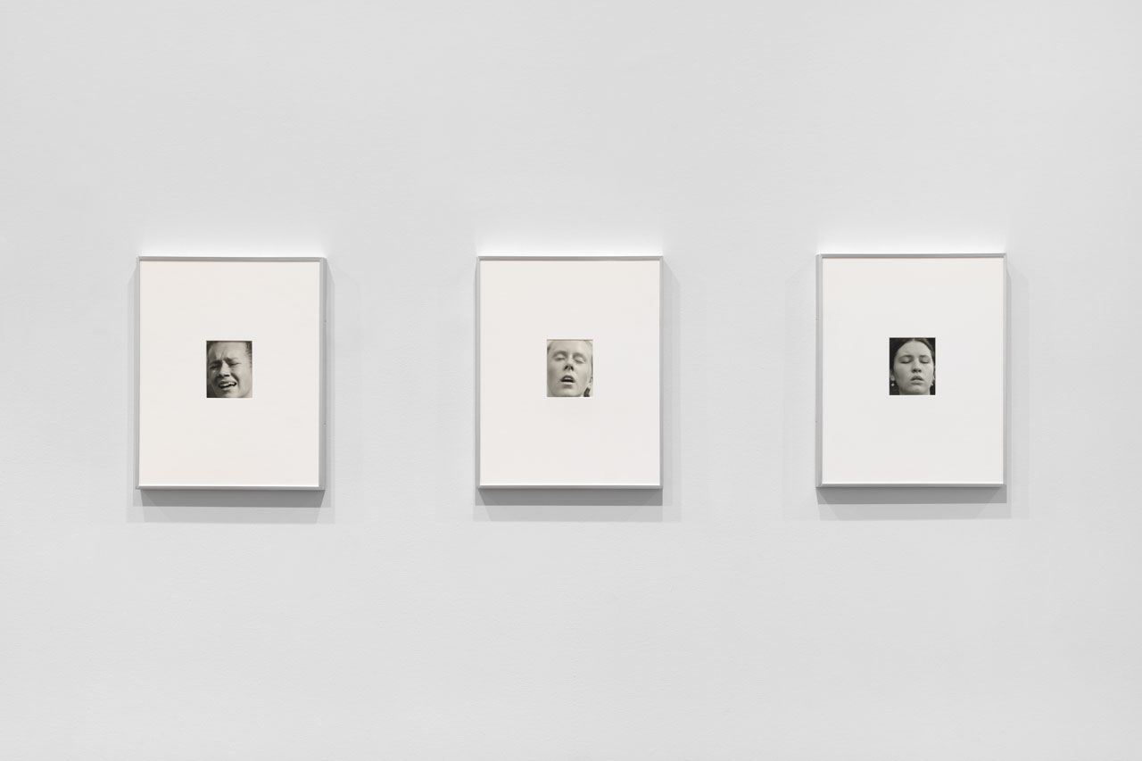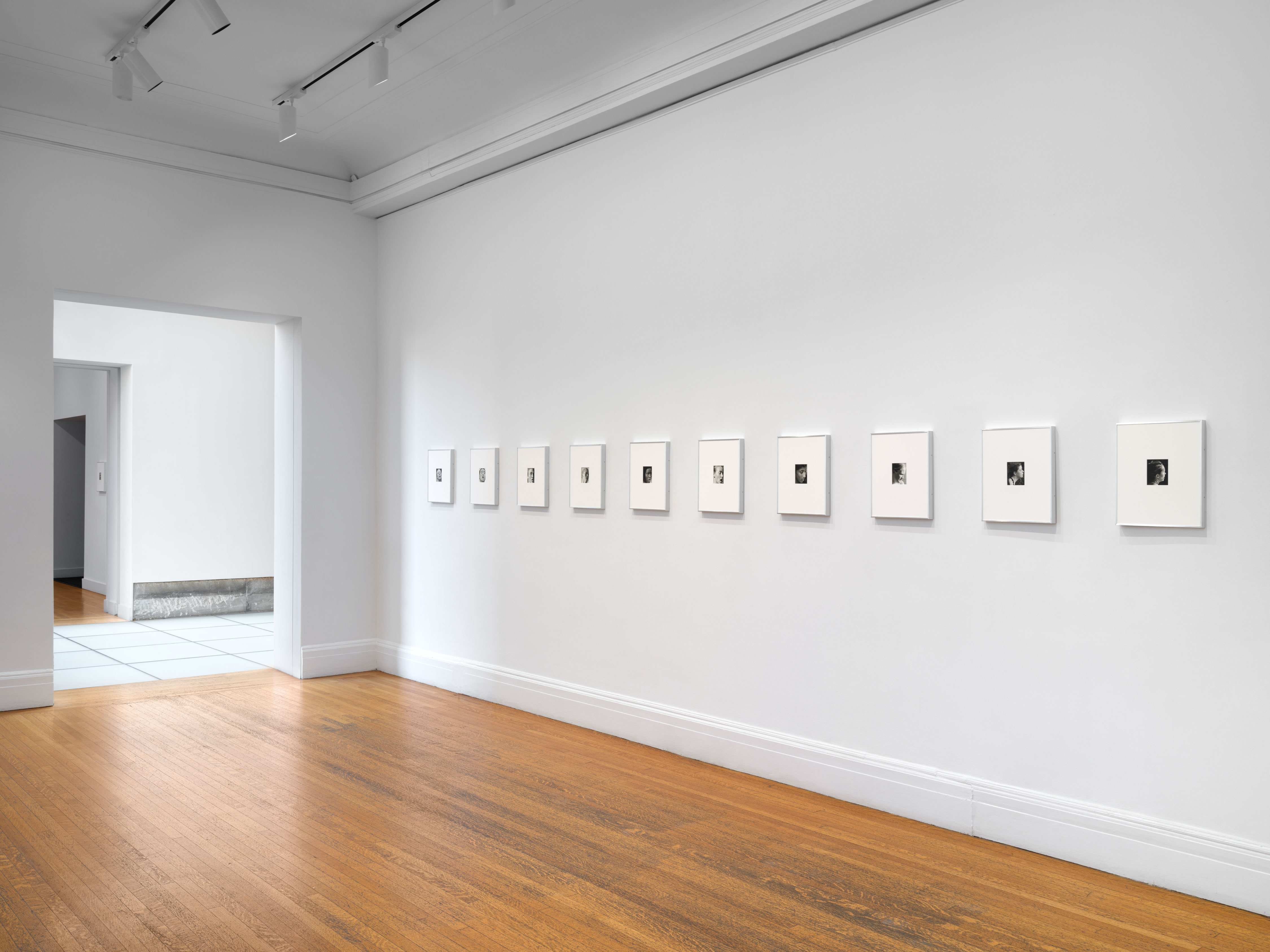 Five Kilometers, Contis’s first major film, follows the faces of three girls as they run a 5K cross-country race through the Appalachian landscape. It is composed of three single takes, each one beginning with a shot from a starter pistol and ending after the runner completes her course. Each runner occupies a separate time—morning, midday, evening—but, in the gallery, the runners seem to move in unison, the sound of their breathing and footfalls filling the space. Phases, a sequence of twenty-four black-and-white photographs, accompanies the film as a parallel motion study. Contis made these intimate portraits as the runners approached or crossed the finish line. Both works explore running as ecstatic movement and performance—they are portraits of endurance that knot the anxiety and desire often projected onto young women. In them, one witnesses the way bodies moving through time become, for Contis, a way of telling time, their motion determining the shape and structure of her work.